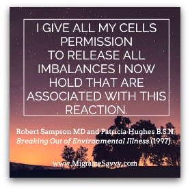 To,One Good Thing To Do After A Long MigraineThe Continuing Pursuit for Migraine Elimination and Pain Reduction You might feel really unstable and dizzy after a long migraine attack, or a short one for that matter. I have found it helpful to clean and ground my energy to help me feel more clear minded after a long attack. A shower helps clean the aura. This is the best time to ground yourself before you go rushing back into life. I don't normally talk about energy, but it has made a big difference to me. I promise I won't be airy fairy for too long! This simple technique is from by Robert Sampson MD and Patricia Hughes B.S.N. in their book Breaking Out of Environmental Illness (1997). It is a great book to read, so here is the proper reference should you like to read it: Sampson, R. and Hughes, P. (1997) Breaking Out of Environmental Illness. Bear & Company Publishing: Santa Fe, NM. pg. 202 1. I now ground myself. 2. Take some deep breaths. 3. I give all my cells permission to release all imbalances I now hold that