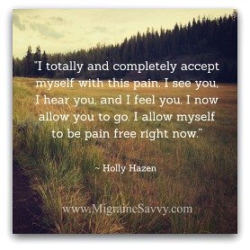 By acknowledging the sensation of the migraine you can bring yourself to take action, instead of trying to ignore it. With a migraine attack, they rarely disappear. In my experience, they never do. The inspiration for this quote "I totally and completely accept myself with this pain" comes from tapping. If you re not familiar with the tapping method - this is a really short version - you can gently tap on your forehead as you say this to yourself, yes out loud is better. But just to yourself is fine too. And then tap on your heart while you repeat it. Repeat three times at least in both locations. Just tap with your index or middle finger until you feel some energy move. It normally only takes a few minutes. But this is helping to shift the energy in those meridian channels. Name one way you have found to accept your pain with this condition. Please click here to share your answer(s) in the Facebook comments box at the bottom of the home page. Essential Migraine Tools